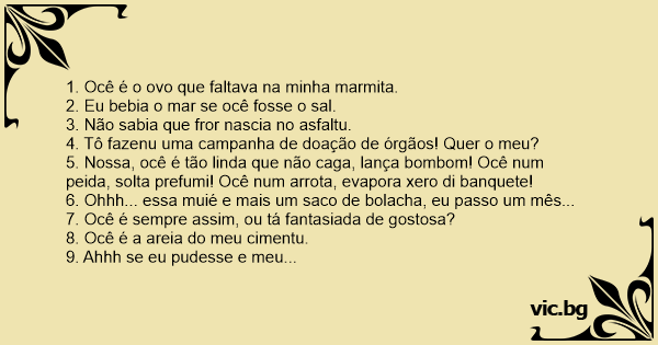 5. Nossa, ocê é tão linda que não caga, lança bombom! Ocê num peida, solta prefumi! Ocê num arrota, evapora xero di banquete!