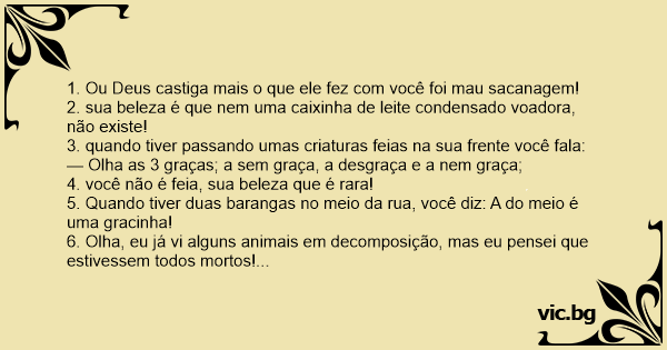 7. você é mais feia do que velha desdentada gritando gol 8. O que aconteceu com você? Tacaram fogo e apagaram na paulada?