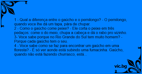 2 - Como o gaúcho come peixe? - Ele corta o peixe em três pedaços: come o do meio, chupa a cabeça e dá o rаво pro vizinho.