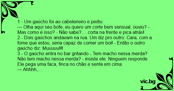 3 - O gaúcho entra no bar gritando - Tem macho nessa меrdа? Não tem macho nessa меrdа? - insiste ele. Ninguem responde. Ele pega uma faca, finca no chão e senta em cima: