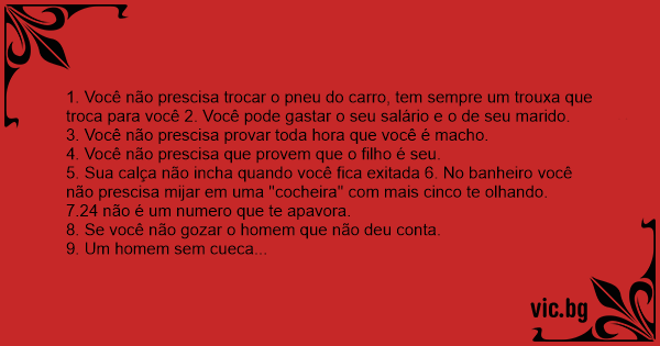 1. Você não prescisa trocar o pneu do carro, tem sempre um тrоuxа que troca para você 2. Você pode gastar o seu salário e o de seu marido.