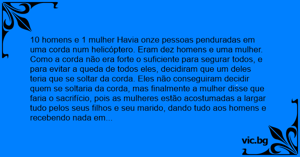 10 homens e 1 mulher Havia onze pessoas penduradas em uma corda num helicóptero. Eram dez homens e uma mulher. Como a corda não era forte o suficiente para segurar todos, e para evitar a queda de todos eles, decidiram que um deles teria que se soltar da corda. Eles não conseguiram decidir quem se soltaria da corda, mas finalmente a mulher disse que faria o sacrifício, pois as mulheres estão acostumadas a largar tudo pelos seus filhos e seu marido, dando tudo aos homens e recebendo nada em troca. Quando ela terminou de falar, todos os homens começaram a BATER PALMAS...