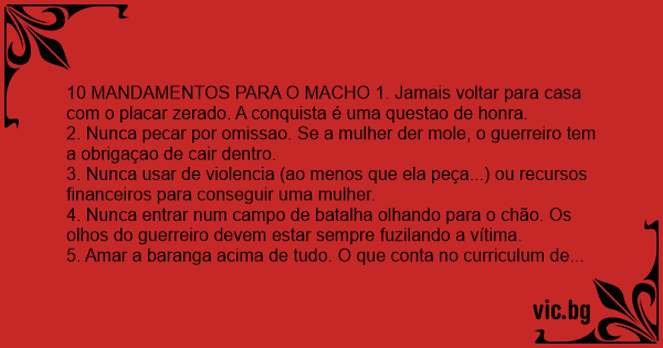 10 MANDAMENTOS PARA O MACHO 1. Jamais voltar para casa com o placar zerado. A conquista é uma questao de honra.