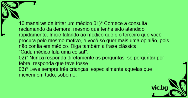 10 maneiras de irritar um médico 01)* Comece a consulta reclamando da demora, mesmo que tenha sido atendido rapidamente. Inicie falando ao médico que é o terceiro que você procura pelo mesmo motivo, e você só quer mais uma opinião, pois não confia em médico. Diga também a frase clássica: