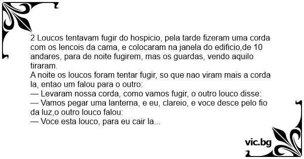 A noite os loucos foram tentar fugir, so que nao viram mais a corda la, entao um falou para o outro: