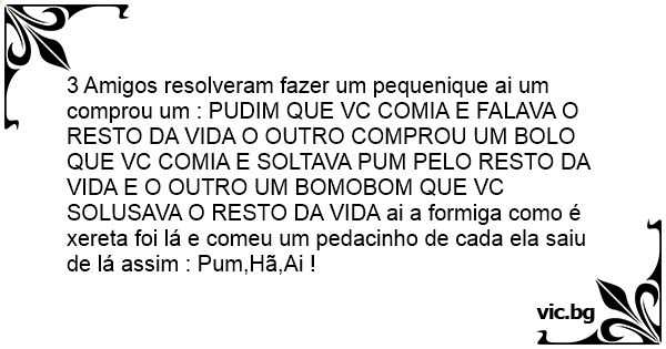 3 Amigos resolveram fazer um pequenique ai um comprou um : PUDIM QUE VC COMIA E FALAVA O RESTO DA VIDA O OUTRO COMPROU UM BOLO QUE VC COMIA E SOLTAVA PUM PELO RESTO DA VIDA E O OUTRO UM BOMOBOM QUE VC SOLUSAVA O RESTO DA VIDA ai a formiga como é xereta foi lá e comeu um pedacinho de cada ela saiu de lá assim : Pum,Hã,Ai !