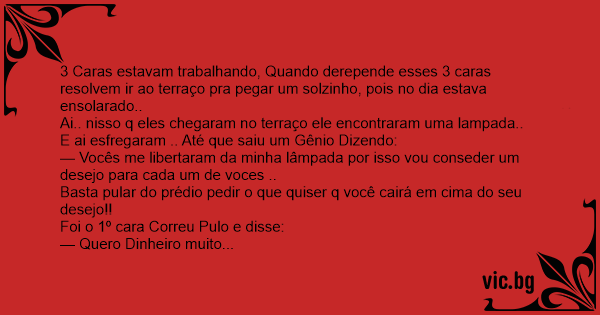3 Caras estavam trabalhando, Quando derepende esses 3 caras resolvem ir ao terraço pra pegar um solzinho, pois no dia estava ensolarado..