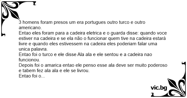 Entao eles foram para a cadeira eletrica e o guarda disse: quando voce estiver na cadeira e se ela não o funcionar quem tive na cadeira estará livre e quando eles estivessem na cadeira eles poderiam falar uma unica palavra.
