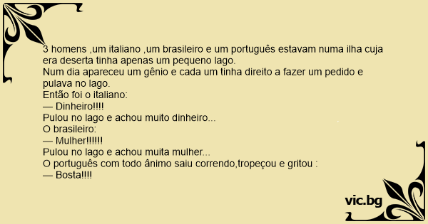 3 homens ,um italiano ,um brasileiro e um português estavam numa ilha cuja era deserta tinha apenas um pequeno lago.