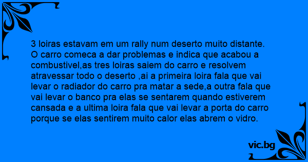 O carro comeca a dar problemas e indica que acabou a combustivel,as tres loiras saiem do carro e resolvem atravessar todo o deserto ,ai a primeira loira fala que vai levar o radiador do carro pra matar a sede,a outra fala que vai levar o banco pra elas se sentarem quando estiverem cansada e a ultima loira fala que vai levar a porta do carro porque se elas sentirem muito calor elas abrem o vidro.