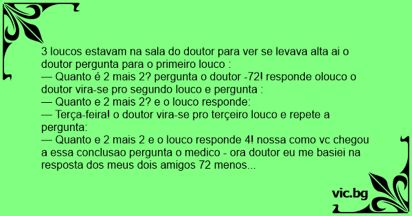— Quanto e 2 mais 2 e o louco responde 4! nossa como vc chegou a essa conclusao pergunta o medico - ora doutor eu me basiei na resposta dos meus dois amigos 72 menos terça-feira é 4 !