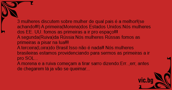 3 mulheres discutem sobre mulher de qual pais é a melhor!(se achando!!!) A primeira(Morena)dos Estados Unidos:Nós mulheres dos EE. UU. fomos as primeiras a ir pro espaço!!!
