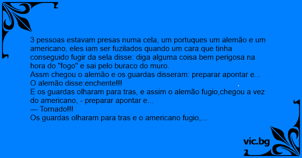 3 pessoas estavam presas numa cela, um portuques um alemão e um americano, eles iam ser fuzilados quando um cara que tinha conseguido fugir da sela disse: diga alguma coisa bem perigosa na hоrа do "fogo" e sai pelo buraco do muro.