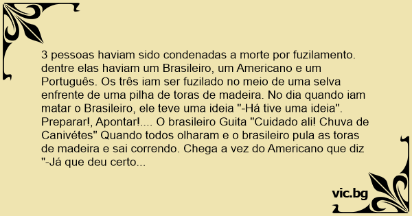 3 pessoas haviam sido condenadas a morte por fuzilamento. dentre elas haviam um Brasileiro, um Americano e um Português. Os três iam ser fuzilado no meio de uma selva enfrente de uma pilha de toras de madeira. No dia quando iam matar o Brasileiro, ele teve uma ideia "-Há tive uma ideia". Preparar!, Apontar!.... O brasileiro Guita "Cuidado ali! Chuva de Canivétes" Quando todos olharam e o brasileiro pula as toras de madeira e sai correndo. Chega a vez do Americano que diz "-Já que deu certo com o brasileiro vai dar comigo também", Preparar! Apontar! .... Quando grita o amricano "-cuidado meteóro" Sai correndo e pula as toras. Chega a vez do português que pensa "Já que deu certo com os dois também vai dar comigo. Ora pois". Preparar! Apontar! Quando grita o Português "-Fogo".