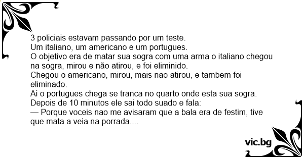 Ai o portugues chega se tranca no quarto onde esta sua sogra. Depois de 10 minutos ele sai todo suado e fala: