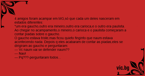 O gaucho estava triste,mas ficou quieto finginto que naum estava acontecendo nada. Depois q eles acabaram de contar as piadas,eles se dirigiram ao gaucho e perguntaram:
