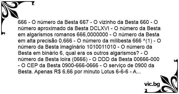 666 - O número da Besta 667 - O vizinho da Besta 660 - O número aproximado da Besta DCLXVI - O número da Besta em algarismos romanos 666,0000000 - O número da Besta em alta precisão 0,666 - O número da milibesta 666 ^(1) - O número da Besta imaginário 1010011010 - O número da Besta em binário 6, qual era os outros algarismos? - O número da Besta loira (0666) - O DDD da Besta 00666-000 - O CEP da Besta 0900-666-0666 - O serviço de 0900 da Besta. Apenas R$ 6,66 por minuto Lotus 6-6-6 - A Planilha de Cálculo da Besta Win666 - O sistema operacional da Besta Pentium 666 - O computador da Besta R$ 665,95 - O preço da Besta R$ 732,60 - O preço da Besta acrescido de 10% de gorjeta.