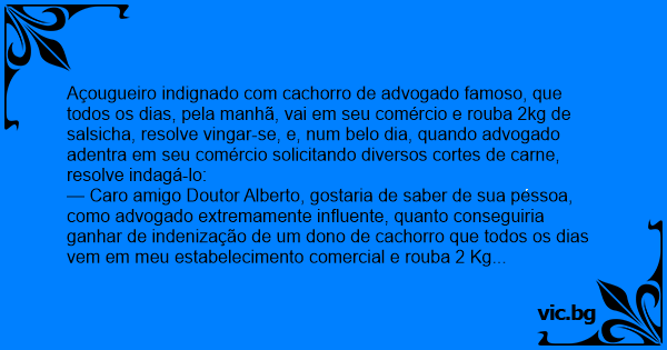 Açougueiro indignado com сасhоrrо de advogado famoso, que todos os dias, pela manhã, vai em seu comércio e rouba 2kg de salsicha, resolve vingar-se, e, num belo dia, quando advogado adentra em seu comércio solicitando diversos cortes de carne, resolve indagá-lo: