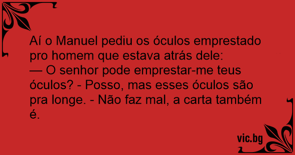 — O senhor pode emprestar-me teus óculos? - Posso, mas esses óculos são pra longe. - Não faz mal, a carta também é.