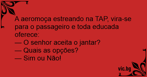 A aeromoça estreando na TAP, vira-se para o passageiro e toda educada oferece: