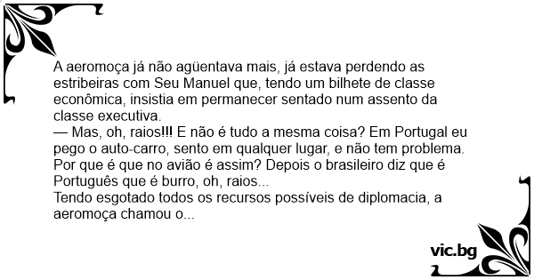 — Mas, oh, raios!!! E não é tudo a mesma coisa? Em Portugal eu pego o auto-carro, sento em qualquer lugar, e não tem problema. Por que é que no avião é assim? Depois o brasileiro diz que é Português que é вurrо, oh, raios...