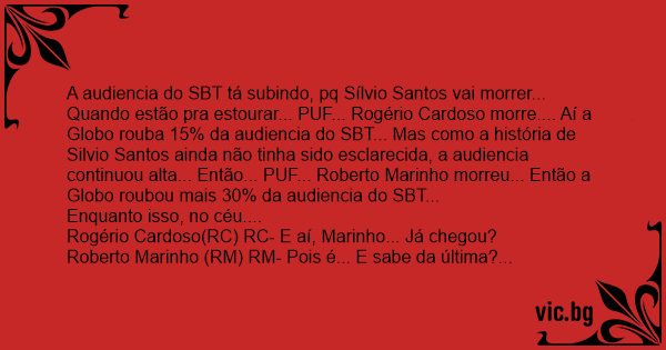 A audiencia do SBT tá subindo, pq Sílvio Santos vai morrer... Quando estão pra estourar... PUF... Rogério Cardoso morre.... Aí a Globo rouba 15% da audiencia do SBT... Mas como a história de Silvio Santos ainda não tinha sido esclarecida, a audiencia continuou alta... Então... PUF... Roberto Marinho morreu... Então a Globo roubou mais 30% da audiencia do SBT...