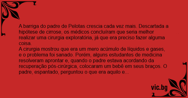 A cirurgia mostrou que era um mero acúmulo de líquidos e gases, e o problema foi sanado. Porém, alguns estudantes de medicina resolveram aprontar e, quando o padre estava acordando da recuperação pós-cirúrgica, colocaram um bebê em seus braços. O padre, espantado, perguntou o que era aquilo e os rapazes disseram que era o que havia saído de sua barriga...