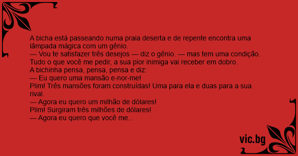 — Vou te satisfazer três desejos — diz o gênio. — mas tem uma condição. Tudo o que você me pedir, a sua pior inimiga vai receber em dobro.
