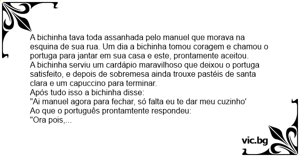 A bichinha tava toda assanhada pelo manuel que morava na esquina de sua rua. Um dia a bichinha tomou coragem e chamou o portuga para jantar em sua casa e este, prontamente aceitou.