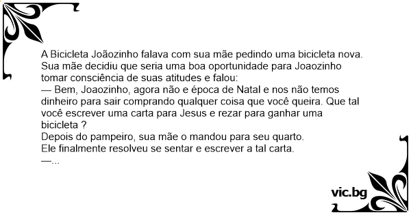 — Bem, Joaozinho, agora não e época de Natal e nos não temos dinheiro para sair comprando qualquer coisa que você queira. Que tal você escrever uma carta para Jesus e rezar para ganhar uma bicicleta ?