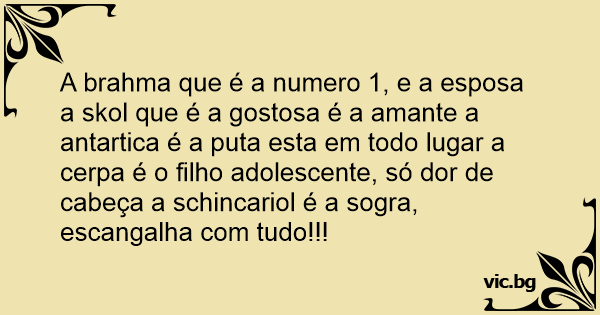A brahma que é a numero 1, e a esposa a skol que é a gostosa é a amante a antartica é a рuта esta em todo lugar a cerpa é o filho adolescente, só dor de cabeça a schincariol é a sogra, escangalha com tudo!!!