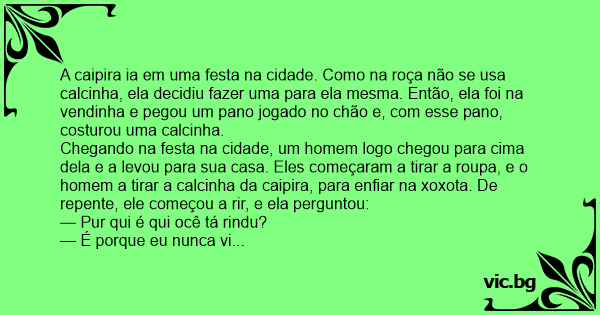 Chegando na festa na cidade, um homem logo chegou para cima dela e a levou para sua casa. Eles começaram a tirar a roupa, e o homem a tirar a calcinha da caipira, para enfiar na xоxота. De repente, ele começou a rir, e ela perguntou: