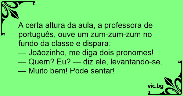 A professora pede ao Joãozinho: — Joãozinho, fale 3 pronomes! — Quem? Eu? Por quê? E a professore responde: — Parabéns Joãozinho! Corretíssimo!