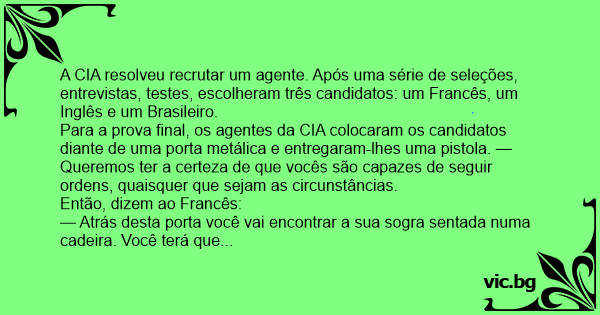 Ao Inglês deram as mesmas instruções. Ele pegou a arma entrou na sala e após cinco minutos regressou com lágrimas nos olhos. — Tentei mas não posso matar a minha sogra.