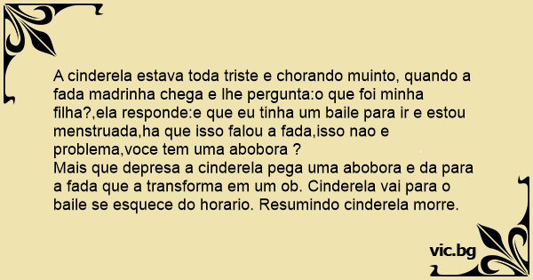 A cinderela estava toda triste e chorando muinto, quando a fada madrinha chega e lhe pergunta:o que foi minha filha?,ela responde:e que eu tinha um baile para ir e estou menstruada,ha que isso falou a fada,isso nao e problema,voce tem uma abobora ?