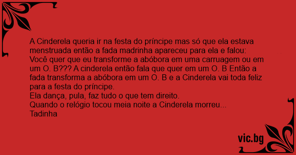 A Cinderela queria ir na festa do príncipe mas só que ela estava menstruada então a fada madrinha apareceu para ela e falou: