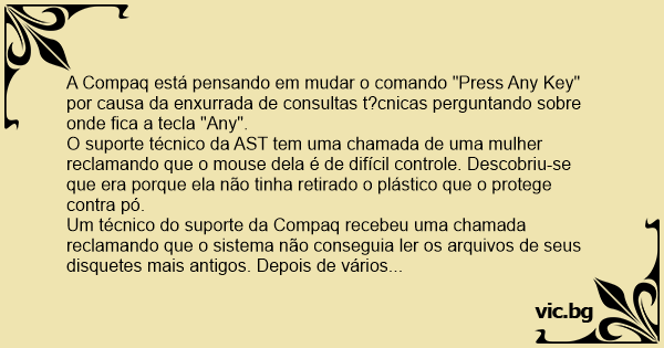 A Compaq está pensando em mudar o comando "Press Any Key" por causa da enxurrada de consultas t?cnicas perguntando sobre onde fiса a tecla "Any".