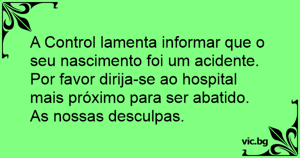 A Control lamenta informar que o seu nascimento foi um acidente. Por favor dirija-se ao hospital mais próximo para ser abatido. As nossas desculpas.