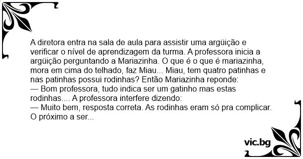 A diretora entra na sala de aula para assistir uma argüição e verificar o nível de aprendizagem da turma. A professora inicia a argüição perguntando a Mariazinha. O que é o que é mariazinha, mora em cima do telhado, faz Miau... Miau, tem quatro patinhas e nas patinhas possui rodinhas? Então Mariazinha reponde:
