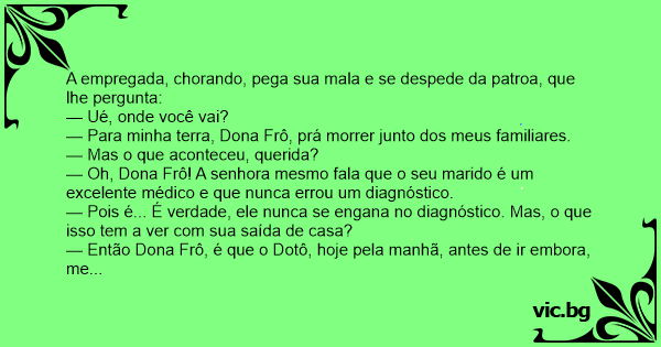 — Oh, Dona Frô! A senhora mesmo fala que o seu marido é um excelente médico e que nunca errou um diagnóstico.