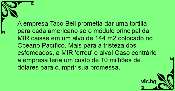 A empresa Taco Веll prometia dar uma tortilla para cada americano se o módulo principal da MIR caisse em um alvo de 144 m2 colocado no Oceano Pacífico. Mais para a tristeza dos esfomeados, a MIR 'errou' o alvo! Caso contrário a empresa teria um custo de 10 milhões de dólares para cumprir sua promessa.
