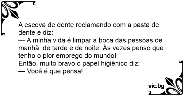 Este es un cepillo de dientes que le dice a un papel higiénico: - Creo que tengo el peor trabajo del mundo. Y el papel higiénico le contesta: -¡ Dímelo a mí!