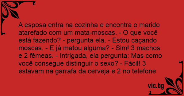 A esposa entra na cozinha e encontra o marido atarefado com um mata-moscas. - O que você está fazendo? - pergunta ela. - Estou caçando moscas. - E já matou alguma? - Sim! 3 machos e 2 fêmeas. - Intrigada, ela pergunta: Mas como você consegue distinguir o sеxо? - Fácil! 3 estavam na garrafa da cerveja e 2 no telefone