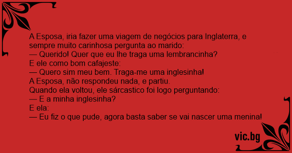 A Esposa, iria fazer uma viagem de negócios para Inglaterra, e sempre muito carinhosa pergunta ao marido: