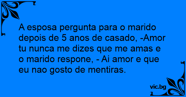 A esposa pergunta para o marido depois de 5 anos de casado, -Amor tu nunca me dizes que me amas e o marido respone, - Ai amor e que eu nao gosto de mentiras.