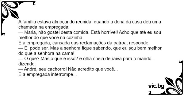 — É, pode ser. Mas a senhora fique sabendo, que eu sou bem melhor do que a senhora na cama!