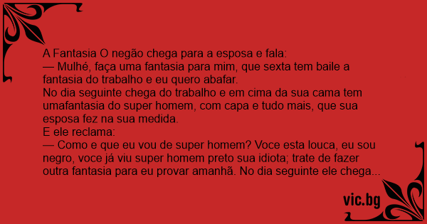 — Como e que eu vou de super homem? Voce esta louca, eu sou nеgrо, voce já viu super homem preto sua idiота; trate de fazer outra fantasia para eu provar amanhã. No dia seguinte ele chega e tem uma fantasia do batman, que sua esposa fez com a maior dificuldade, mas no capricho.