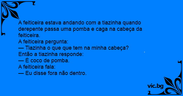 A feiticeira estava andando com a tiazinha quando derepente passa uma pomba e caga na cabeça da feiticeira.