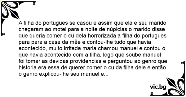 A filha do portugues se casou e assim que ela e seu marido chegaram ao motel para a noite de núpicias o marido disse que queria comer o cu dela horrorizada a filha do portugues para para a casa da mãe e contou-lhe tudo que havia acontecido, muito irritada maria chamou manuel e contou o que havia acontecido com a filha, logo que soube manuel foi tomar as devidas providencias e perguntou ao genro que historia era essa de querer comer o cu da filha dele e então o genro explicou-lhe seu manuel e que eu casei no civil e no religioso e então eu tenho direito aos dois o senhor não acha, manuel coçou a cabeça e disse tens razão e voltou para casa ao chegar em casa perguntou e então manuel matastes o саnаlhа.