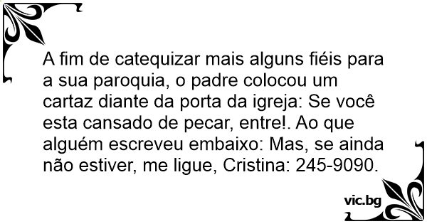 A fim de catequizar mais alguns fiéis para a sua paroquia, o padre colocou um cartaz diante da porta da igreja: Se você esta cansado de pecar, entre!. Ao que alguém escreveu embaixo: Mas, se ainda não estiver, me ligue, Cristina: 245-9090.
